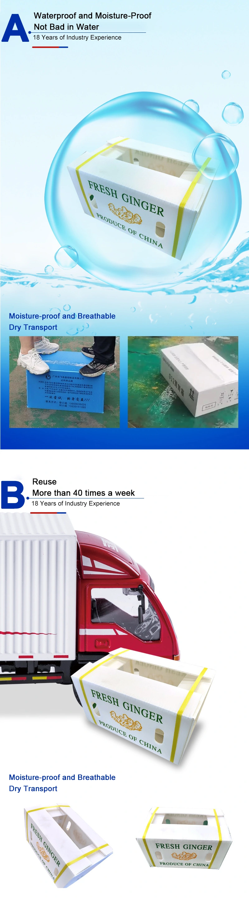 పిపి వెజిటబుల్ ఫ్రెష్ కీపింగ్ బాక్సుల యొక్క ప్రయోజనాలు మన్నిక, తక్కువ బరువు, ప్యాలెట్ పరిమాణానికి అనుకూలత మరియు నిల్వ సమయంలో వ్యవసాయ ఉత్పత్తులను తాజాగా మరియు తేమగా ఉంచే సామర్థ్యం. ఈ కార్టన్లు జలనిరోధిత మరియు తేమ ప్రూఫ్, మరియు 100% పునర్వినియోగపరచదగినవి. తాజా వ్యవసాయ ఉత్పత్తులు మార్కెట్ చేయడానికి చాలా తక్కువ సమయం ఉన్నాయి, కాబట్టి రవాణా మరియు ప్యాకేజింగ్ యొక్క ఖచ్చితత్వం ఒక ముఖ్యమైన అంశం. పిపి పదార్థాలు ఆహారంతో పరిచయం కోసం అనుకూలంగా ఉంటాయి, కాబట్టి వాటిని విశ్వాసంతో ఉపయోగించవచ్చు.